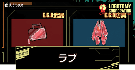 Lobotomy Corporation(ロボトミーコーポレーション)のE.G.O「ラブ」の性能を紹介。溶ける愛から手に入るE.G.Oギフトも掲載しているので、Lobotomy CorporationでE.G.O「ラブ」の性能を知りたい方はどうぞ。