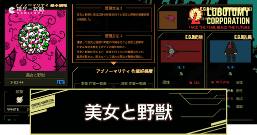 Lobotomy Corporation(ロボトミーコーポレーション)の「美女と野獣(F-02-44)」の管理方法を紹介。「美女と野獣」の特殊能力や抽出E.G.Oも掲載しているので、Lobotomy Corporationで「美女と野獣」を管理するコツを知りたい方はどうぞ。