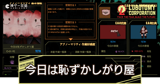Lobotomy Corporation(ロボトミーコーポレーション)の「今日は恥ずかしがり屋(O-01-92)」の管理方法を紹介。「今日は恥ずかしがり屋」の特殊能力や抽出E.G.Oも掲載しているので、Lobotomy Corporationで「今日は恥ずかしがり屋」を管理するコツを知りたい方はどうぞ。