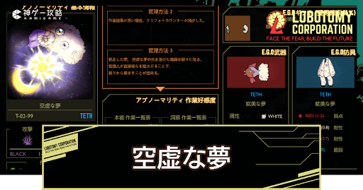 Lobotomy Corporation(ロボトミーコーポレーション)の「空虚な夢(T-02-99)」の管理方法を紹介。「空虚な夢」の特殊能力や抽出E.G.Oも掲載しているので、Lobotomy Corporationで「空虚な夢」を管理するコツを知りたい方はどうぞ。