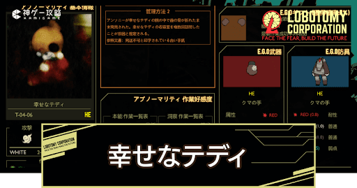 Lobotomy Corporation(ロボトミーコーポレーション)の「幸せなテディ(T-04-06)」の管理方法を紹介。「幸せなテディ」の特殊能力や抽出E.G.Oも掲載しているので、Lobotomy Corporationで「幸せなテディ」を管理するコツを知りたい方はどうぞ。