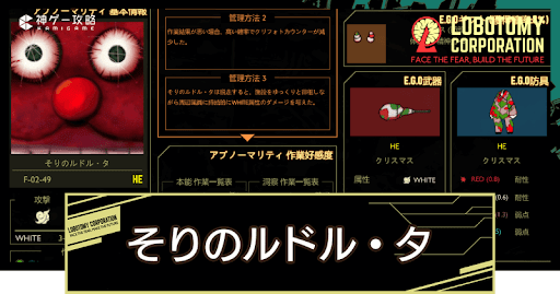 Lobotomy Corporation(ロボトミーコーポレーション)の「そりのルドル・タ(F-02-49)」の管理方法を紹介。「そりのルドル・タ」の特殊能力や抽出E.G.Oも掲載しているので、Lobotomy Corporationで「そりのルドル・タ」を管理するコツを知りたい方はどうぞ。