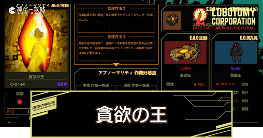Lobotomy Corporation(ロボトミーコーポレーション)の「貪欲の王(O-01-64)」の管理方法を紹介。「貪欲の王」の特殊能力や抽出E.G.Oも掲載しているので、Lobotomy Corporationで「貪欲の王」を管理するコツを知りたい方はどうぞ。