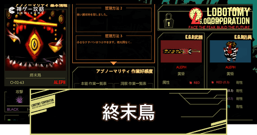 Lobotomy Corporation(ロボトミーコーポレーション)の「終末鳥(O-02-63)」の管理方法を紹介。「終末鳥」の特殊能力や抽出E.G.Oも掲載しているので、Lobotomy Corporationで「終末鳥」を管理するコツを知りたい方はどうぞ。