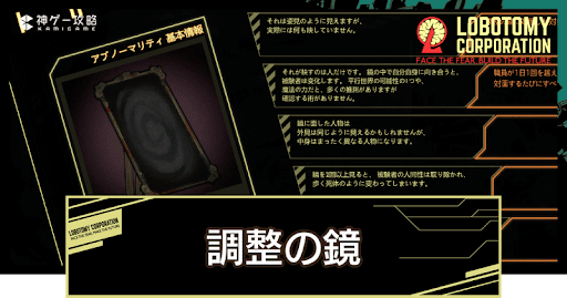 調整の鏡は使用した職員のステータスを再分配するアブノーマリティだ。育てにくいステータスが一気に伸びる可能性がある一方、ステータスの合計値が再分配前よりも減少する場合もある。また、職員が調整の鏡が2回以上使うとステータスの合計値が確実に下がるためデメリットが大きくなる。