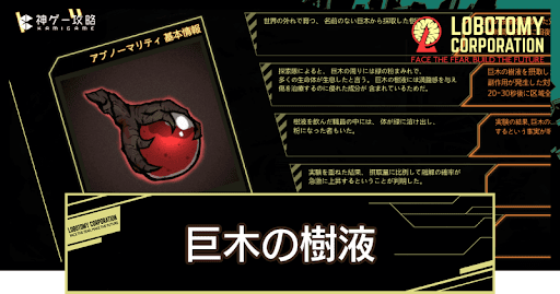 Lobotomy Corporation(ロボトミーコーポレーション)の「巨木の樹液(T-09-80)」の特殊能力を紹介。「巨木の樹液」の管理方法や活用方法も掲載しているので、Lobotomy Corporationで「巨木の樹液」を管理するコツを知りたい方はどうぞ。