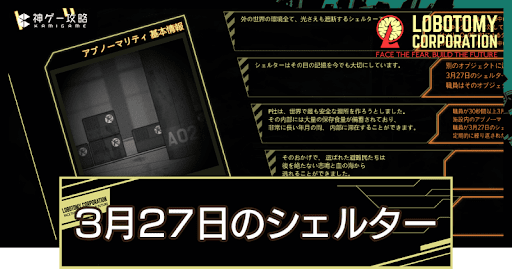 「3月27日のシェルター」の特殊能力は、職員1体の生存を確保しながらボスやアブノーマリティを同士討ちさせるといった使い道もある。適切なアブノーマリティがいれば「終末鳥」といったALEPHアブノーマリティ鎮圧にも利用できるため、行き詰まったら活用してみよう。