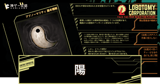 Lobotomy Corporation(ロボトミーコーポレーション)の「陽(O-07-103)」の特殊能力を紹介。「陽」の管理方法や活用方法も掲載しているので、Lobotomy Corporationで「陽」を管理するコツを知りたい方はどうぞ。