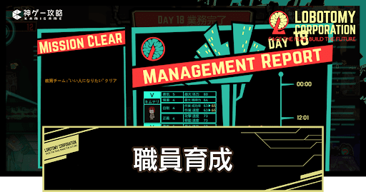 Lobotomy Corporation(ロボトミーコーポレーション)の職員の育成方法をご紹介。経験値を効率的に稼ぐ方法や、職員育成の仕様検証データも掲載しているので、Lobotomy Corporationで職員を育成する時の参考にどうぞ。