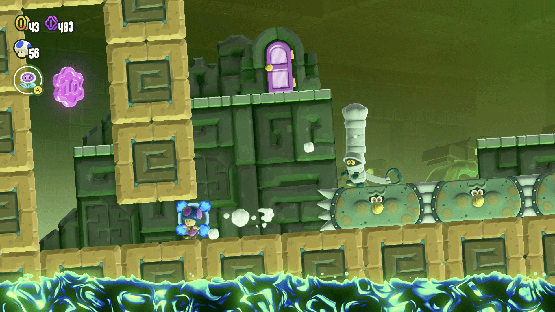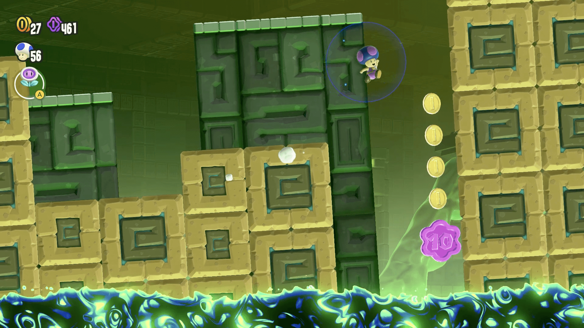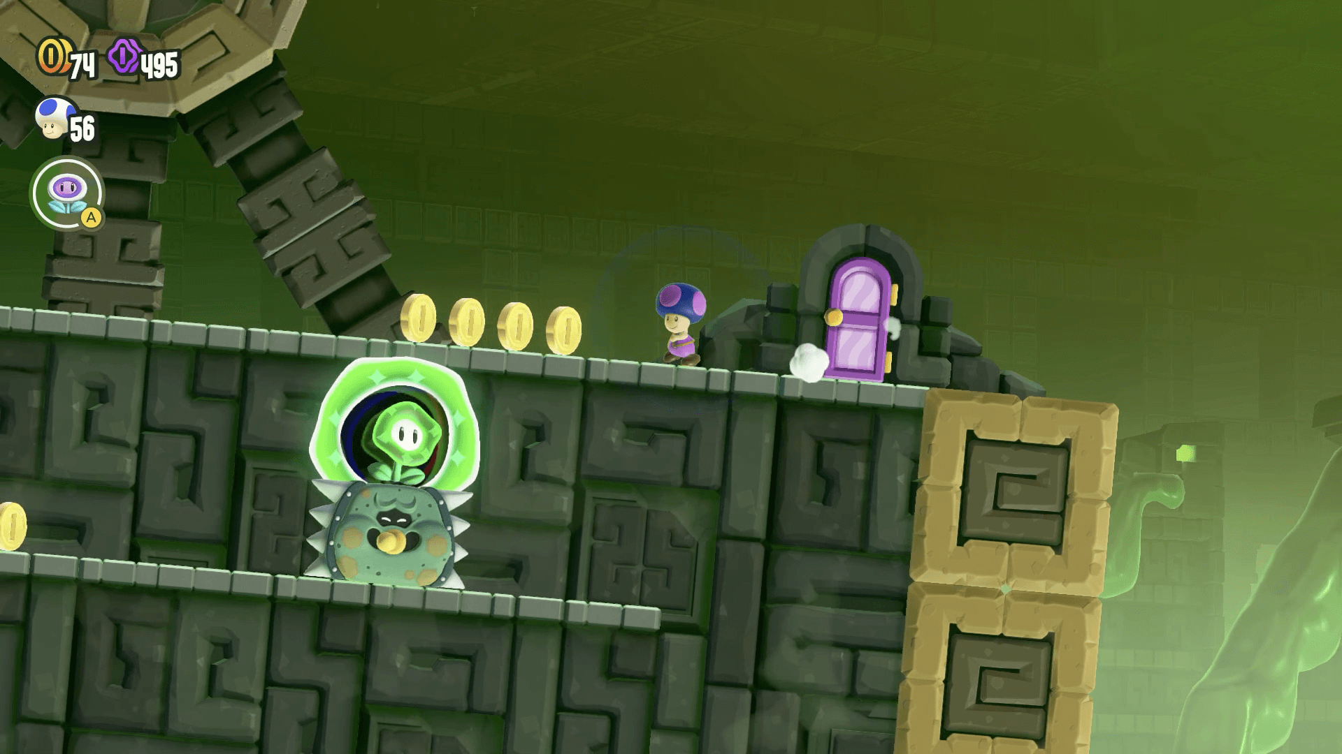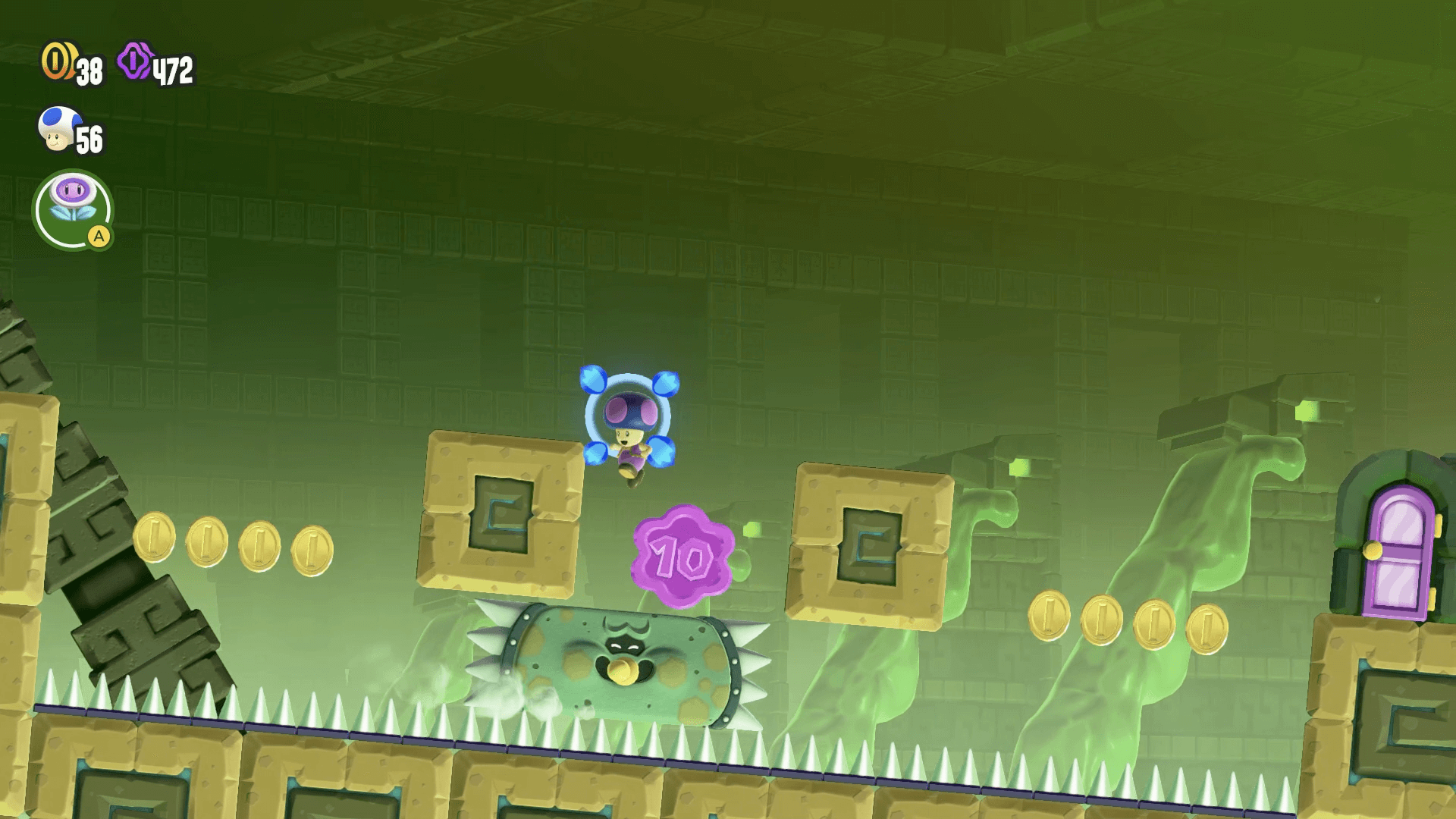 ワンダーフラワーを取るとステージが変化し、滑るスライム床の上を通りながらワンダーシードを回収することになる。時間制限は90秒だが、区間は短いため、落ち着いてタイミングを見て進もう。