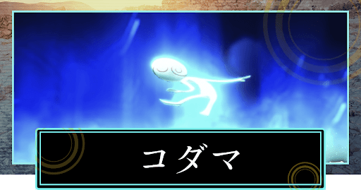 | 日本の伝承に語られる、草木の霊。樹齢百年を超える樹木に宿るといわれ、その名は「木霊」と書く。山間で声などの音が反響することを「こだまする」と言うが、かつてこの現象はコダマが返事をしているものだと考えられていた。 |