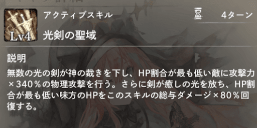 | 無数の光の剣が神の裁きを下し、 HP割合が最も低い敵に攻撃力× 340%の物理攻撃を行う。 さらに剣が癒しの光を放ち、 HP割合が最も低い味方のHPをこのスキルの総与ダメージ80%回復する。【レベルアップ効果1 - Lv21で解放】 物理攻撃のダメージが攻撃力×380%、 HP回復量がこのスキルの総与ダメージ ×120%になる。 【レベルアップ効果2 - Lv101で解放】 さらに物理攻撃の後、 自身の腕力×125%の直接攻撃を行う。【レベルアップ効果3 - Lv181で解放】 さらにこのスキルで敵を戦闘不能にできなかった場合、このスキルを再発動する (再発動は1回まで)。 |