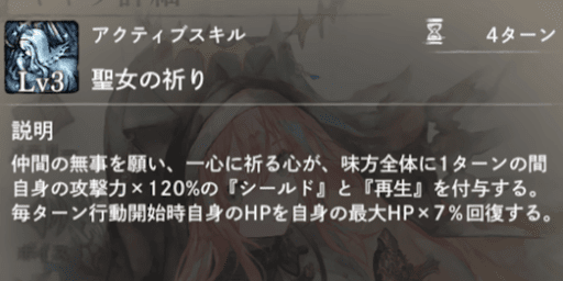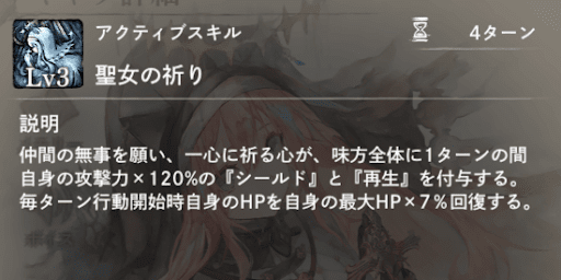| 仲間の無事を願い、一心に祈る心が、味方全体に1ターンの間自身の攻撃力×120%の 『シールド』 と 『再生』 を付与する。毎ターン行動開始時自身のHPを自身の最大HP×7%回復する。【レベルアップ効果1 - Lv81で解放】 『シールド』の大きさが自身の攻撃力×150%になる。【レベルアップ効果2 - Lv161で解放】 『シールド』 と 『再生』 のターン数がそれぞれ2ターンになる。 |