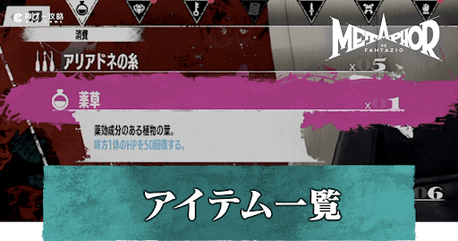 メタファー:リファンタジオのアイテムについて解説。全アイテムの効果を掲載し、名前や分類に合わせて検索することもできます。メタファーでアイテムを探す際の参考にどうぞ。