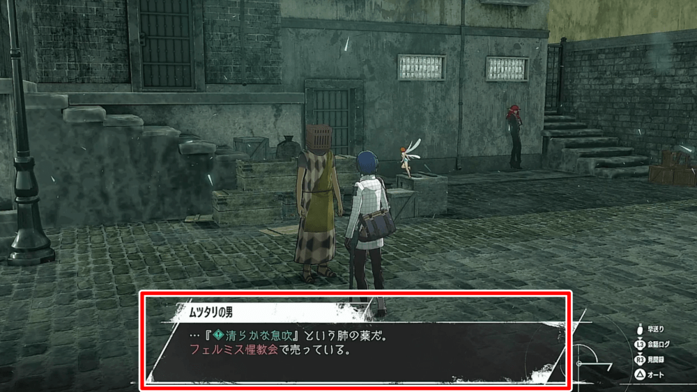 サンルメオ中央通りにある「フェルミス惺教会」に向かい、500リーブで清らかな息吹を購入しよう。惺教会には「浄化」で度々訪れる事になるため、場所を把握しておくと良い。