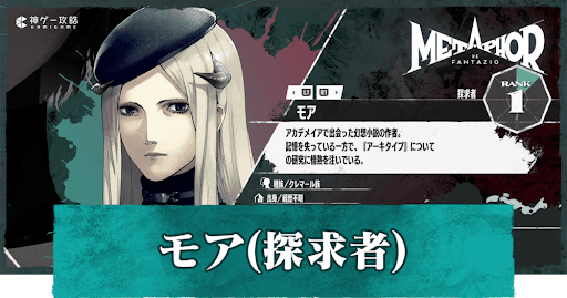 メタファー:リファンタジオの支援者「モア(探求者)」について解説。モアとの支援開始条件や解放されるアーキタイプ、支援ランクを上げた際の効果や会話のMAG獲得量についても掲載。メタファー(アトラス)をプレイする際の参考にどうぞ。