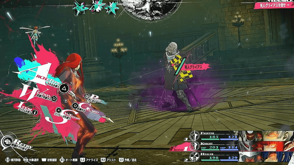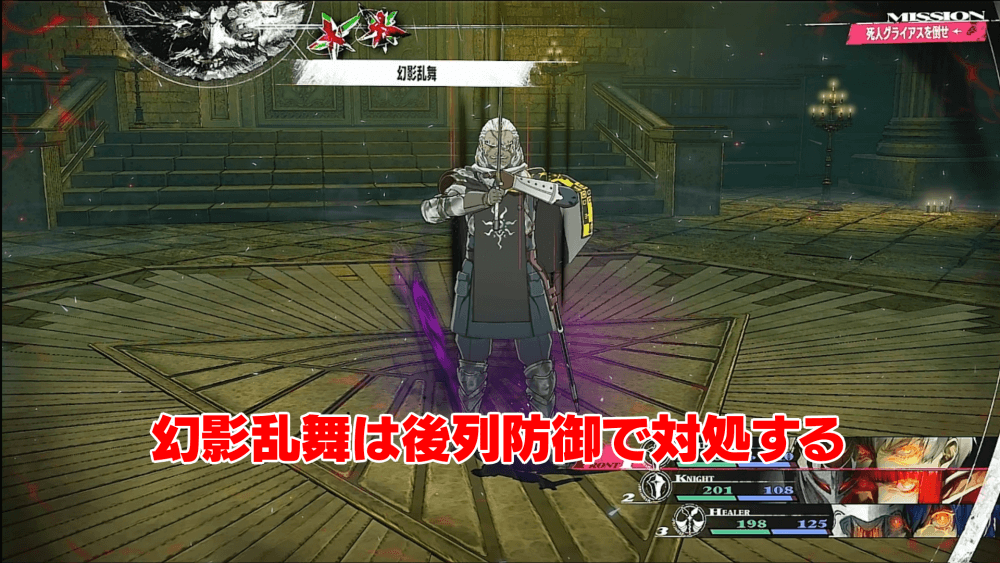 死人グライアスは、1ターン目に全体攻撃の幻影乱舞を使ってくるため、全員後列に下げて防御するのがおすすめ。以降の攻撃は常に単体攻撃になるので、1ターン目さえ乗り切れば楽に戦闘を進められる。