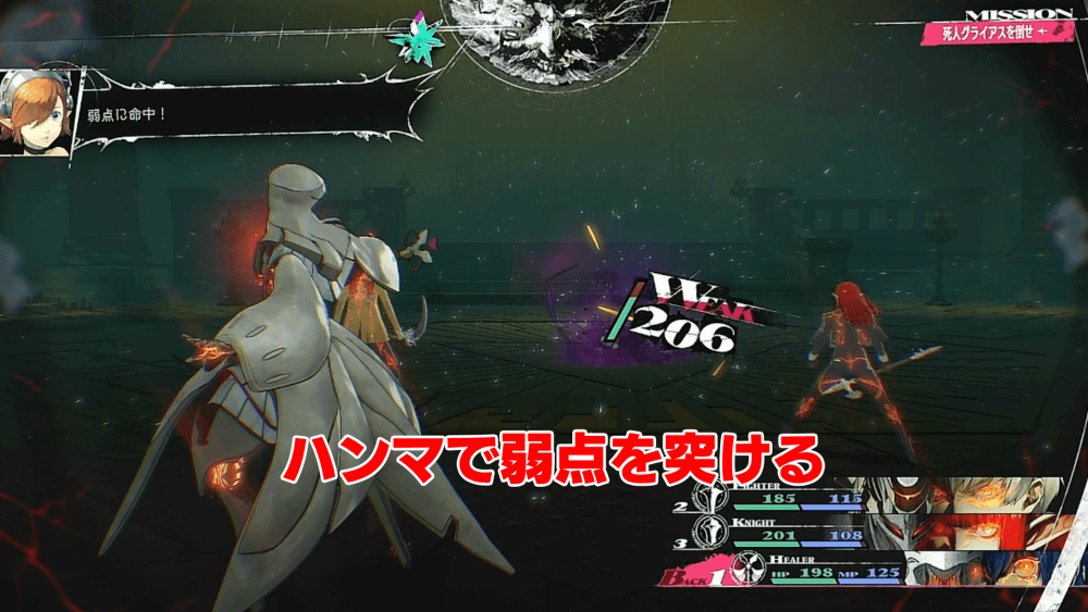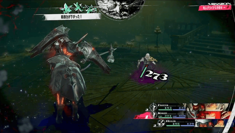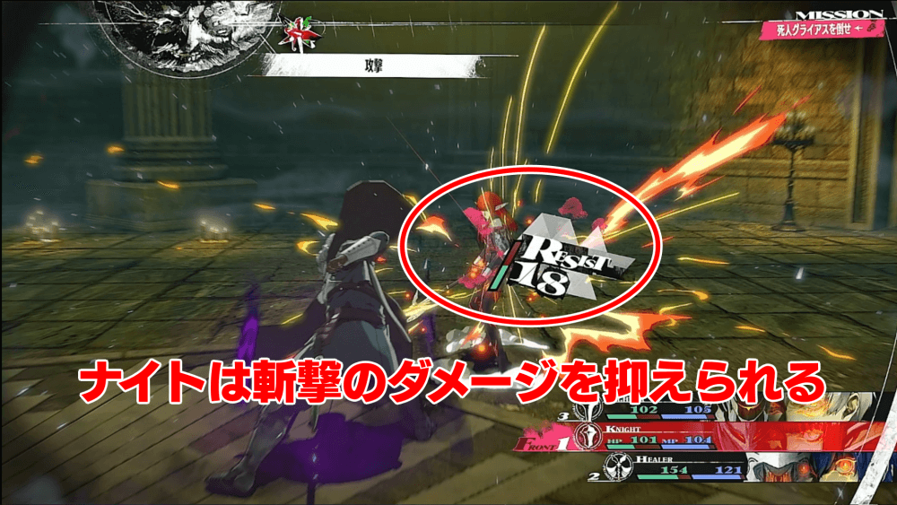 ナイトのジンテーゼ「ジャンプスラスト」で、敵の防御力を下げよう。また、本作のステータス変化は最大3段階まで有効なため、以後もジャンプスラストを撃てば、さらにグライアスの防御力を下げられる