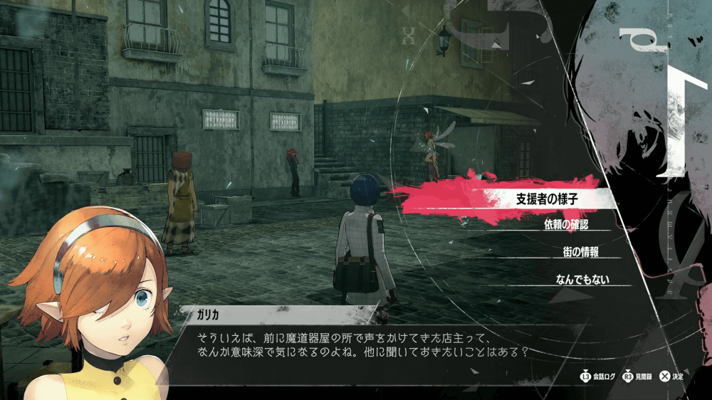 △ボタンでガリカに100回ヒントを聞くとトロフィー「最高の隣人」を獲得できるため、こまめにヒントを聞こう。支援者の様子や依頼の確認では、時間帯ごとに実行可能な行動を教えてくれる。街の情報では新しい依頼や資質が上がる場所のヒント、アイテムの入手場所などの情報を入手可能だ。