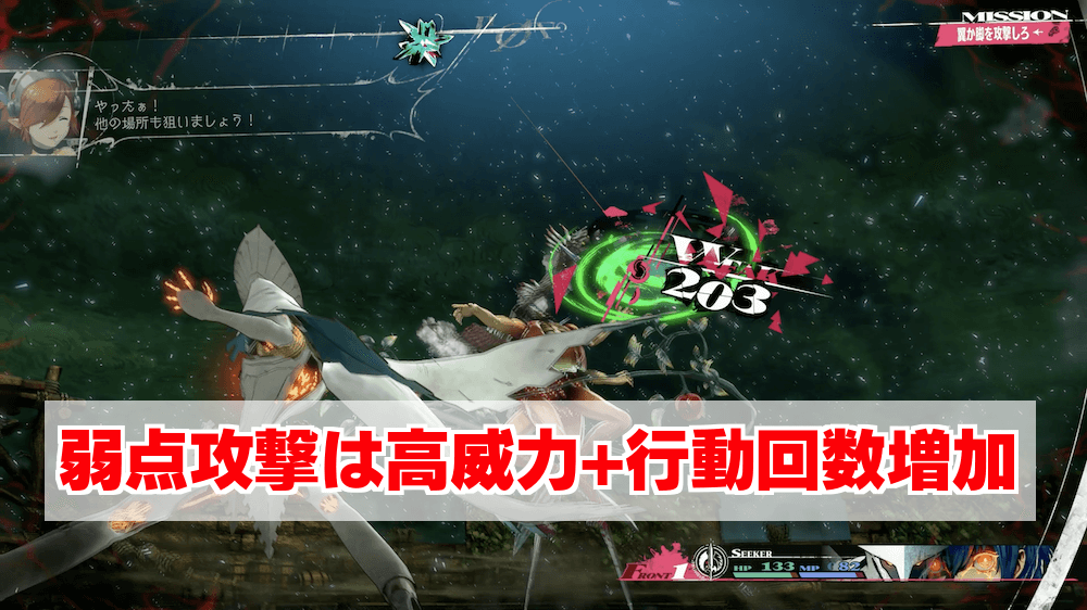 イベント発生後は主にサイクを使用して攻撃し、ダメージを稼ごう。1ターン経過後からは脚と翼に攻撃でき、両方とも破壊すると敵の攻撃力が大きく下がる。弱点攻撃で行動回数も増やせるため、必ず両方壊してから戦闘を進めよう。