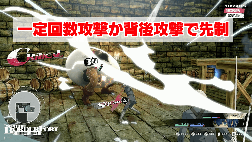 ファストでの先制攻撃が成功すれば大ダメージを与えた上で敵が気絶するため、非常に有利な状態で戦闘が開始する。代わりに敵の攻撃を受けると奇襲状態で開始してしまうため、1~2回攻撃して先制できない場合は◯ボタンの回避で距離をとり、攻撃回避後に改めて先制を狙おう。