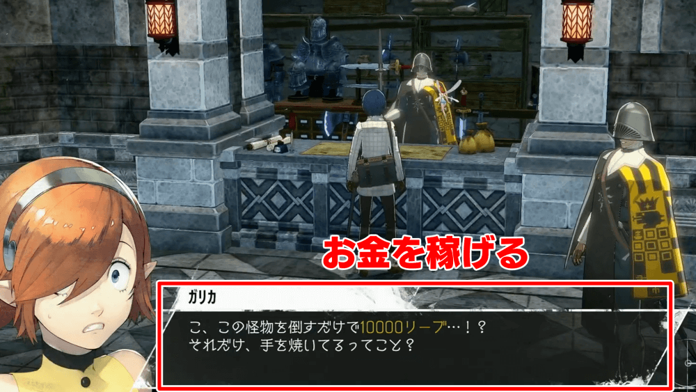 賞金首の依頼をこなすと、大量にお金(リーブ)が手に入る。お金は消耗品の購入はもちろん、装備品の購入や浄化など戦力に繫がるコンテンツにも使用するため、重要度が高い。