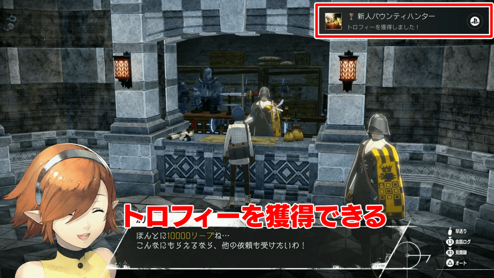 はじめて賞金首を倒して募兵舎で報告すると、「新人バウンティハンター」のトロフィーを入手できる。トロコンを目指す場合、必ず一度は賞金首の依頼をこなそう。