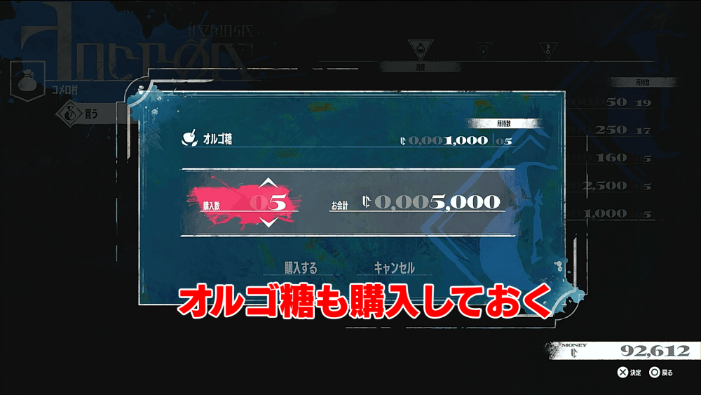 料理の材料として使える、オルゴ糖も同時に購入しておこう。オルゴ糖は古城の街マルティラで購入できないアイテムだが、依頼「料理人を唸らせる一皿を届けろ」で必要になる。