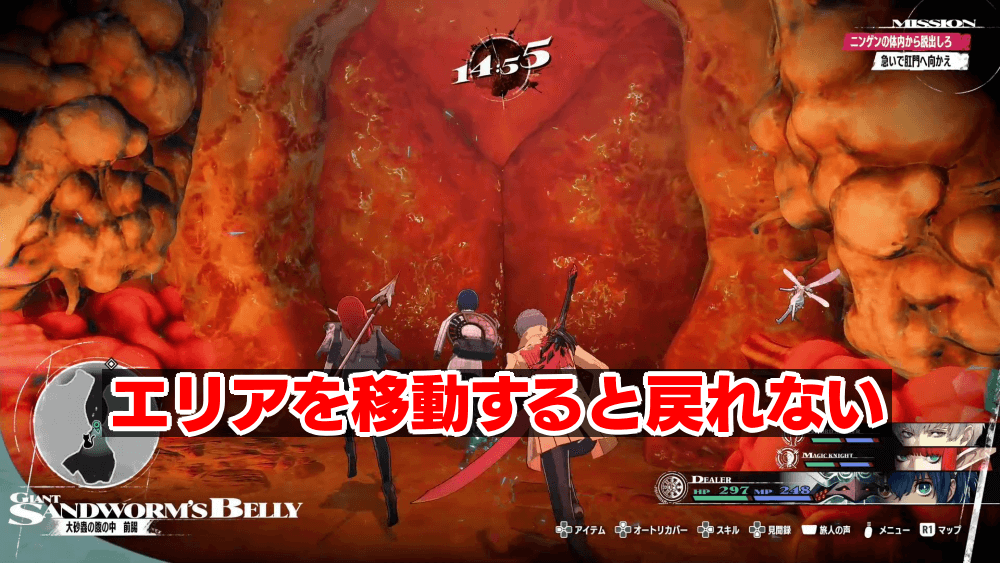 大砂蟲の腹の中は、一度エリアを移動すると戻れなくなる。脱出アイテムの「アリアドネの糸」も使えないため、宝箱やアイテムの取り忘れには注意しよう。