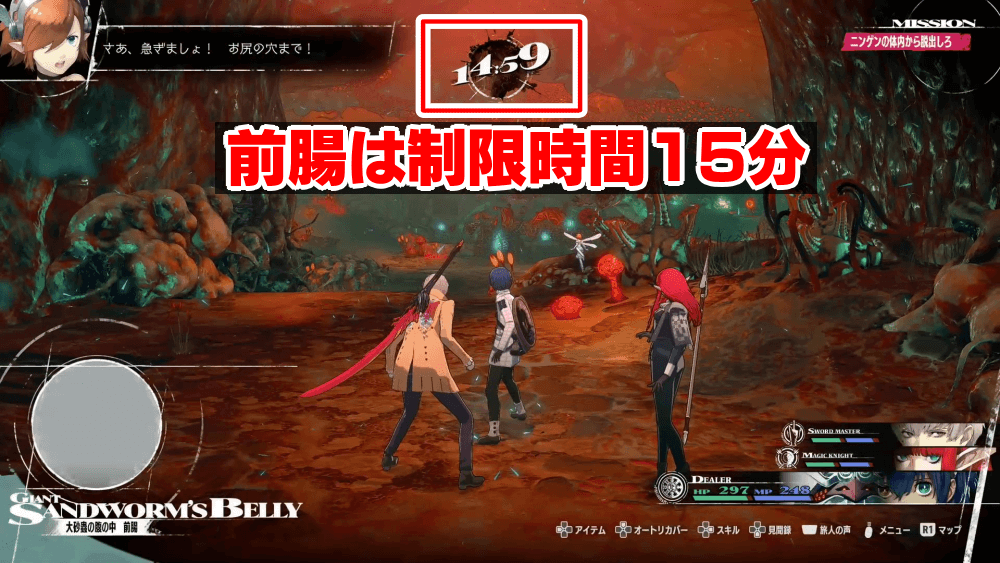 制限時間は前腸に入った時点で15分となっているが、後腸に進むと残り12分になる。前腸の時点で残り12分未満になっていても、後腸に進むと残り12分に戻るため、エリアを移動するまでの制限時間と考えて問題ない。