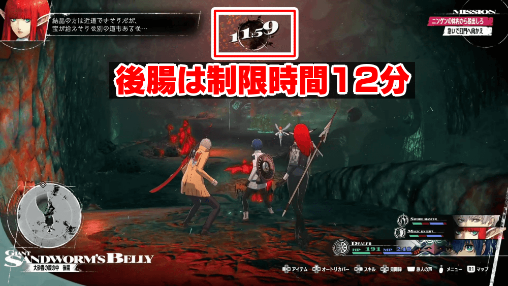 大砂蟲の腹の中は脱出までに制限時間があり、制限時間は戦闘中も減っていくため、道中の敵に苦戦する場合は戦闘を避けると良い。戦闘に時間を取られると、アイテムを回収しきれない可能性もあるため、無理に戦闘をする必要はない。