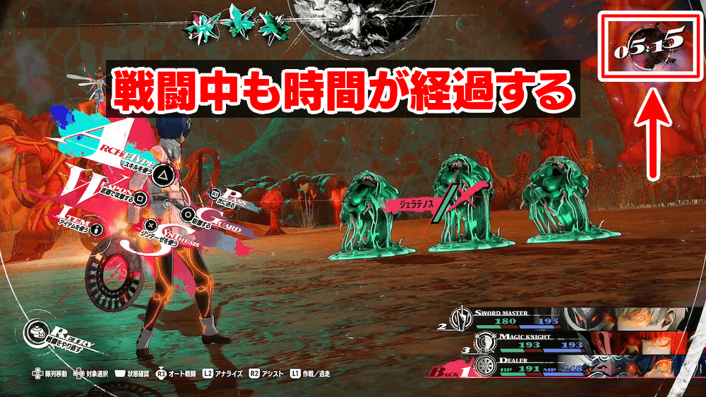 | ファストで倒せない場合は戦闘を避ける戦闘中も時間が経過するメニューやマップを開くと時間経過は止まる |