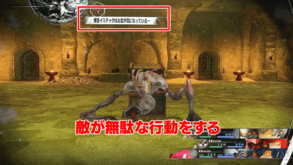 ボスの「秘宝イミテクス」も含めて、宝箱のフリをしている敵には商人のゴールドアタックが有効。ゴールドアタックを使用した次のターンは、敵がプレスアイコン1つ分無駄な行動を取るため、戦闘を楽に進められる。