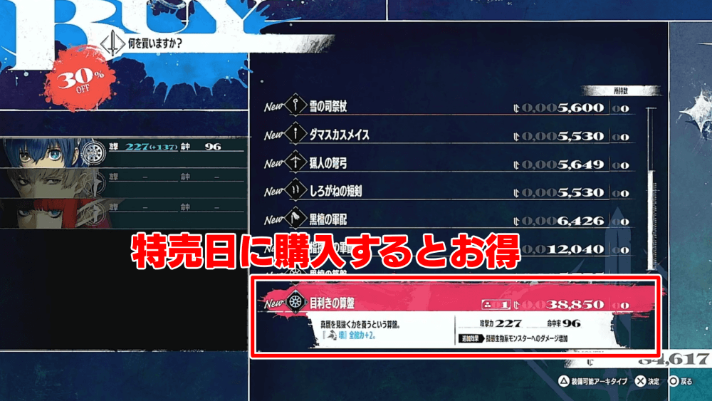 6/29の武器の特売日に、マルティラで目利きの算盤を購入しておくと、ディーラーのダメージが大きく上がり楽に進行できる。ただし目利きの算盤は高価なので、購入した場合は打ち捨てられた墓で少し金策するのがおすすめ。