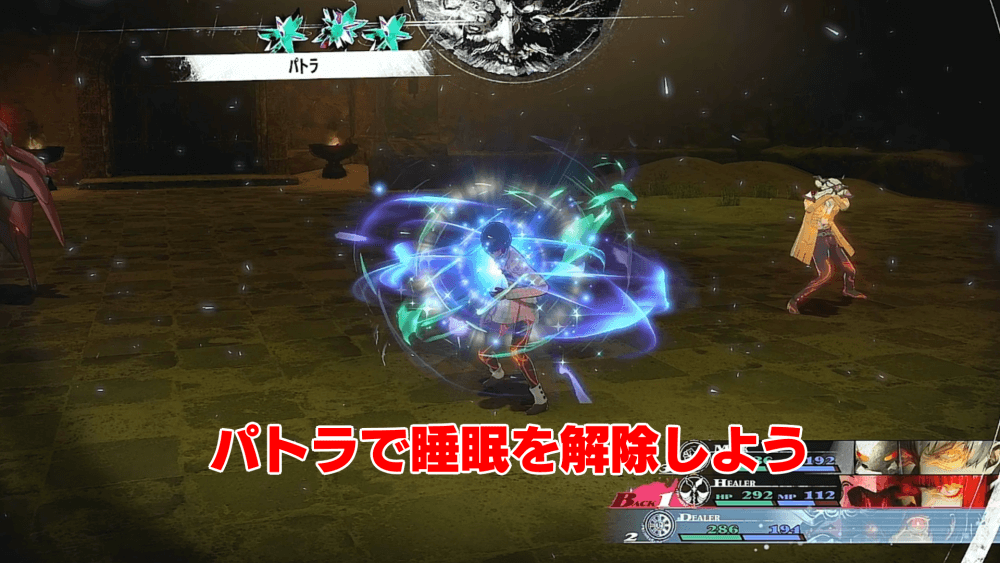 イミテクスが使う睡眠攻撃などには、ヒーラーの「パトラ」で対処しよう。また、所持しているなら、ヒーラーに「ハッカの匂い袋」を装備させて睡眠対策をしておくと良い。