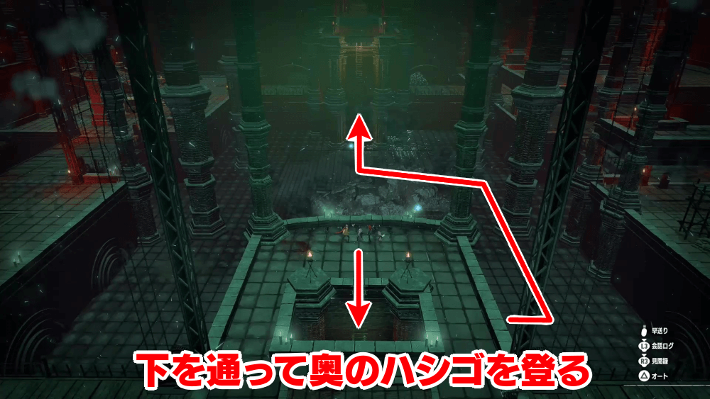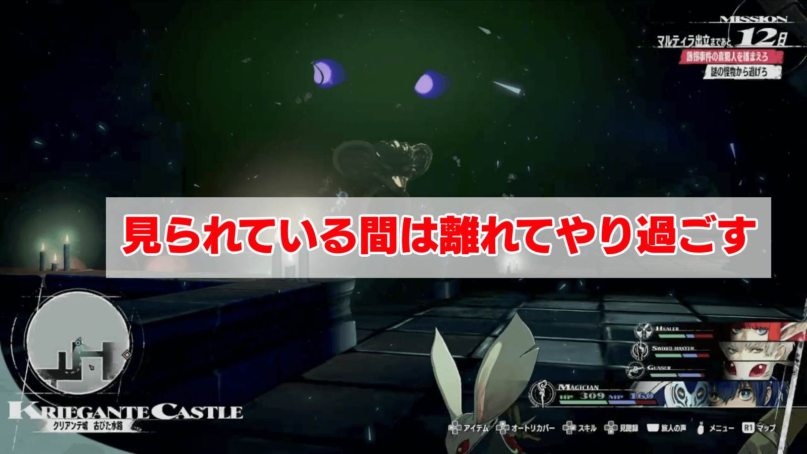 モリスが怪物を呼び出し、辺りが暗くなったら、怪物の視線を避けながら奥へ進もう。一定距離進むと怪物はいなくなり、通常状態に戻る。怪物との戦闘も可能だが、倒しても体力の香を入手できるだけで消耗が激しいため、できる限り避けて通るのがおすすめだ。