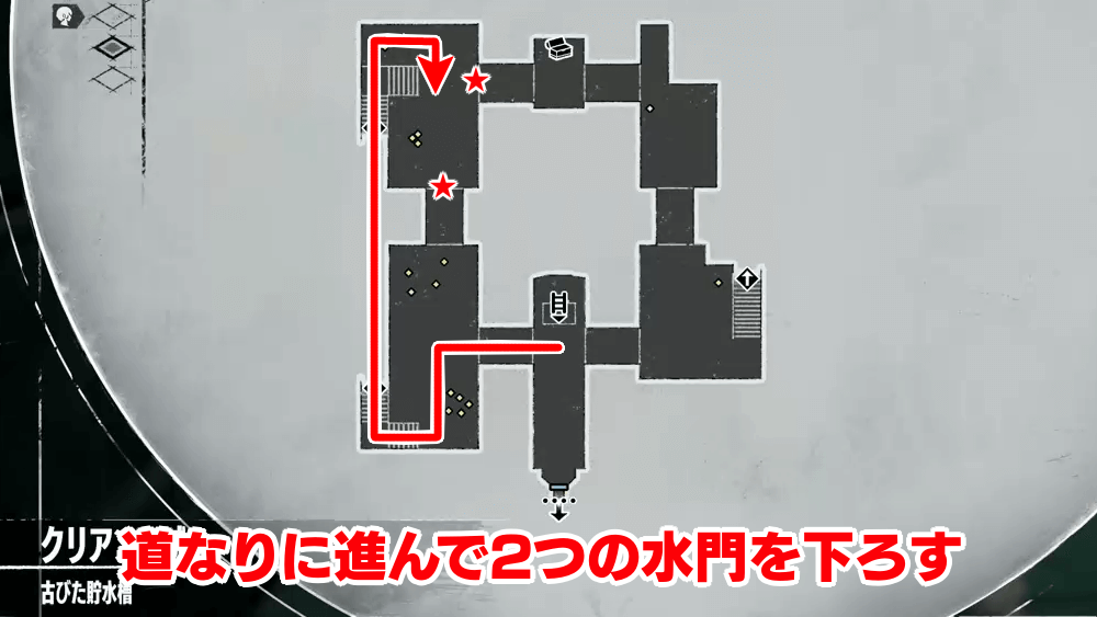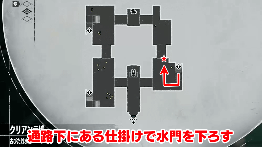 ※ 奥に進んで宝箱を回収しておこう。マップ西側を道なりに進んで2つの水門を下ろすとイベント。 貯水槽のエリア中央のハシゴは、水が溢れていて使用できない。水門のレバーを操作しながら順路を進んでいく必要があるため、合計6つの水門を操作して先に進もう。