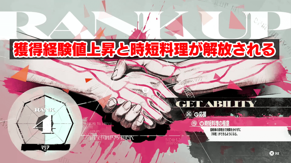 コマンダー解放後は、マリアのランクを最優先で4まで上げよう。バトルでの獲得経験値上昇と、時間経過無しで料理が可能になるアビリティが解放されるため、メリットが非常に大きい。