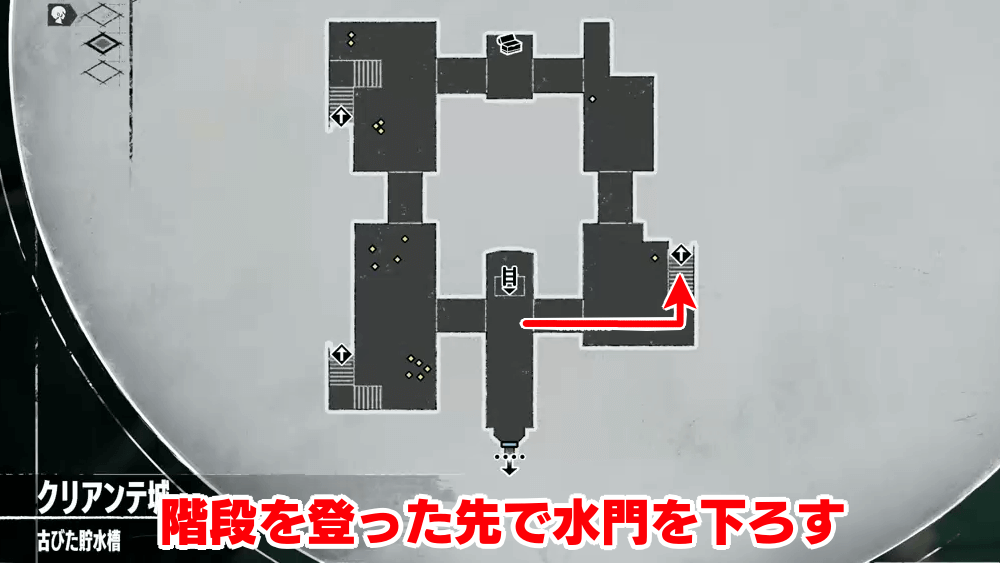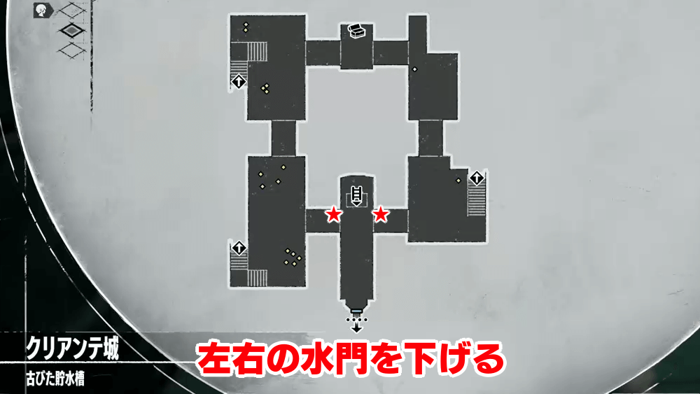 クリアンテ城への道は水門で閉じられており、装置を動かして水門を降ろしながら進むことになる。装置は水門のすぐ横にあり、マップ上で!マークが付いているため、わからなくなったらマップを開いて確認しよう。