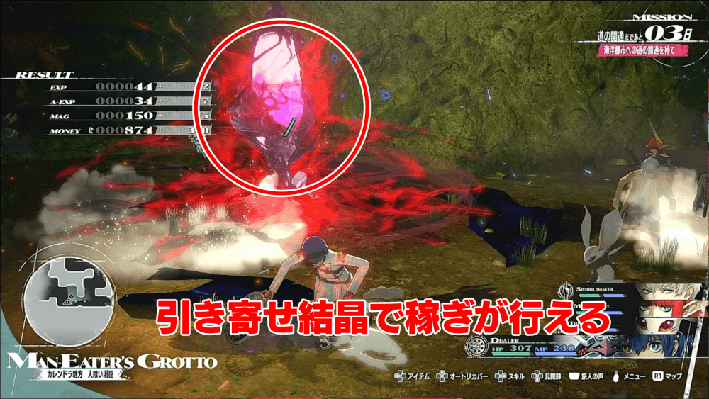 敵が無限に出現する「引き寄せ結晶」があるので、ファストで「岩幼蟲ヴァルモ」を倒せるなら稼ぎが行える。引き寄せ結晶で稼ぐ際は、主人公のアーキタイプをディーラーに変更しておこう。
