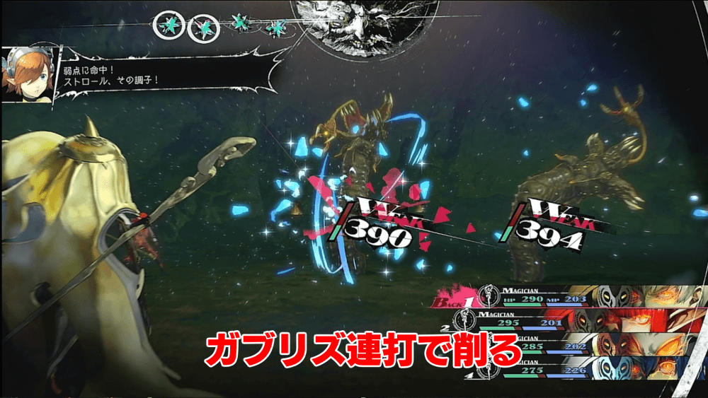 ボス戦は、全員後列からマジシャンのジンテーゼ「ガブリズ」で攻撃し続けるのがおすすめだ。ボスの弱点をつけるため、1ターン中に4人ともジンテーゼを撃つことができ、簡単にダメージを稼げる。