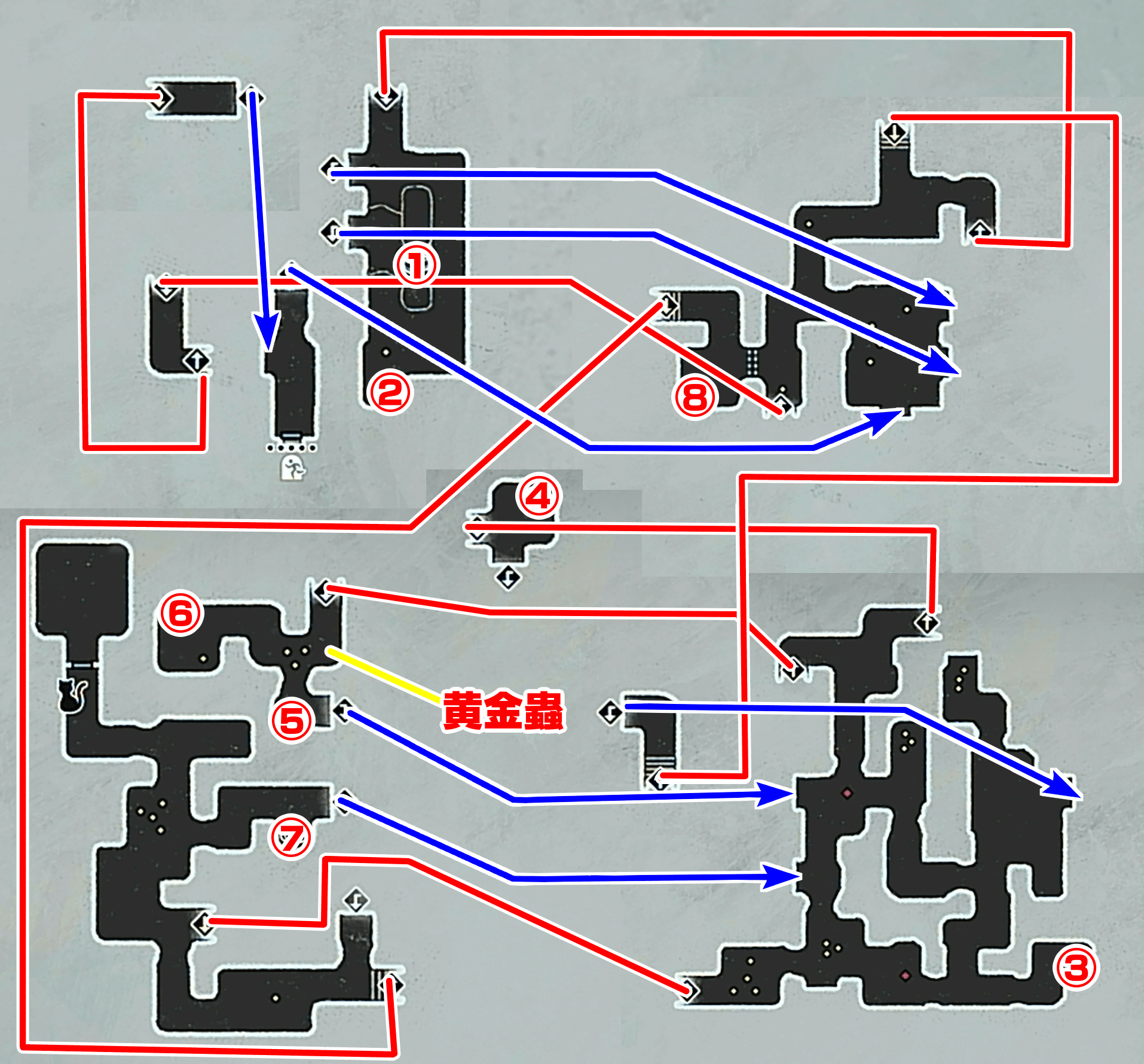 | 9 | 北東に進み坂を上がる ┗坂の手前に黄金蟲がいるため回収しよう |