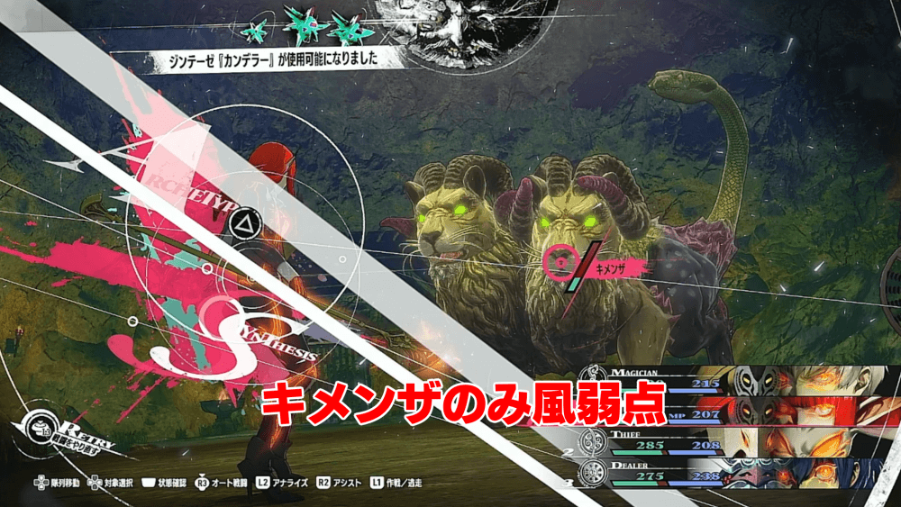 魔術師のアーキタイプなら、風属性が弱点の「キメンザ」以外の敵全てに弱点攻撃が可能だ。唯一キメンザだけがネックになるため、事前に「サイク」などの風属性魔法を継承させておくのがおすすめ。