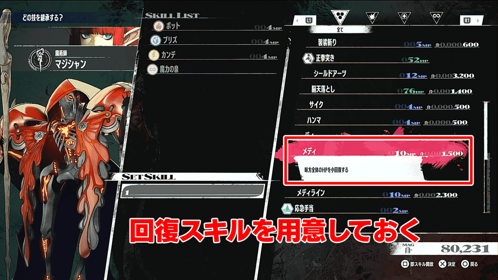 魔のステータスの低い、ハイザメかヒュルケンベルグに回復スキルを継承させておき、回復係を兼任させるのがおすすめ。魔術師のアーキタイプは打たれ弱いので、こまめに回復を挟みつつ進もう。