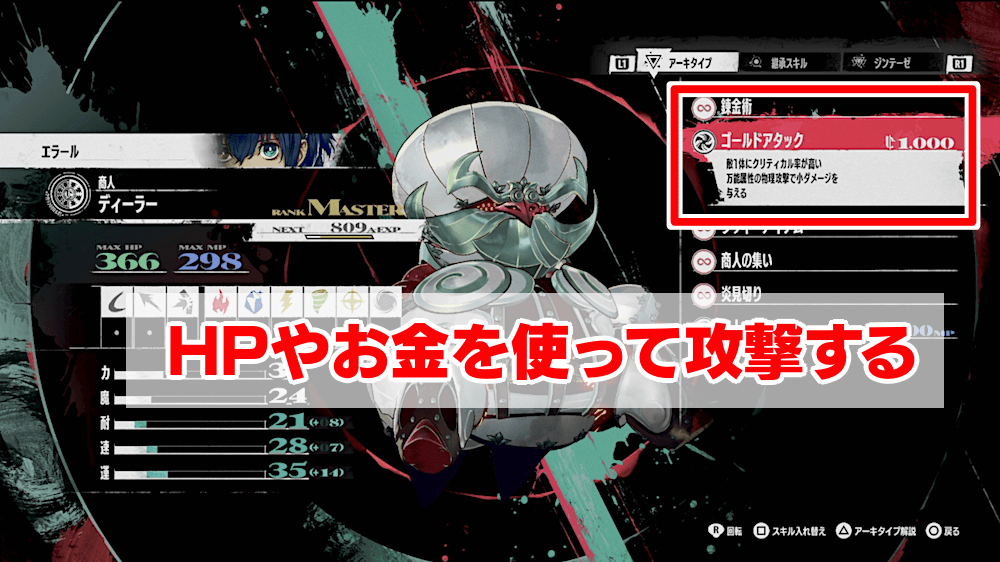 ほとんどのスキルはMPを消費するが、モンクのHP消費技や、ディーラーのお金消費技を中心に戦うことで、MP消費を抑えることはできる。HP回復アイテムは安く数が入手できる他、お金は商人系統のアーキタイプを付けた主人公で敵を気絶させて稼げる。MPよりは簡単に補充できるため、余裕がある場合は積極的に使っていこう。