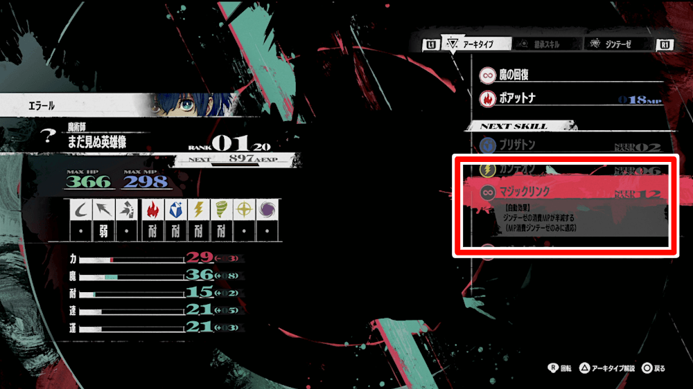 MP消費は消費を軽減する自動効果を持ったアーキタイプを使ったり、対象スキルを継承することで軽減できる。非常に貴重かつ序盤では使えないが、習得するためにマジシャンを優先に育てておくと、入手時期を早めることは可能だ。