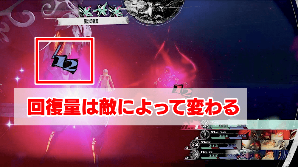 シーフやアサシンのスキル「魔力の強奪」を当てると、当てた味方のMPが回復する。回復量は敵によって変わるため、できるだけ回復量の多い敵に当てて効率を上げよう。