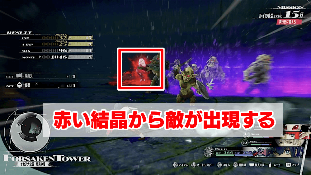 フィールド上にある赤い結晶からは敵が出現し続け、周囲の敵は倒してもすぐに復活する。赤い結晶自体を倒すと復活しなくなるため、活用する場合は残しておこう。
