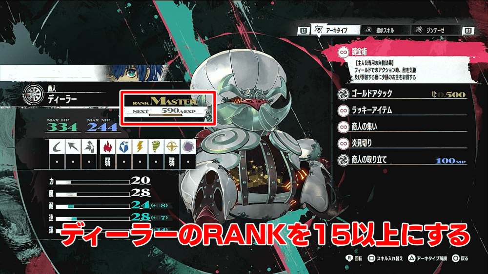 ベルギッタの依頼で解放されるアーキタイプの、「ディーラー」のランクを15まで上げよう。ディーラーはファストで敵を倒すとお金が貰える効果があるため、主人公に装備させてランク上げと金策を兼ねると効率的だ。