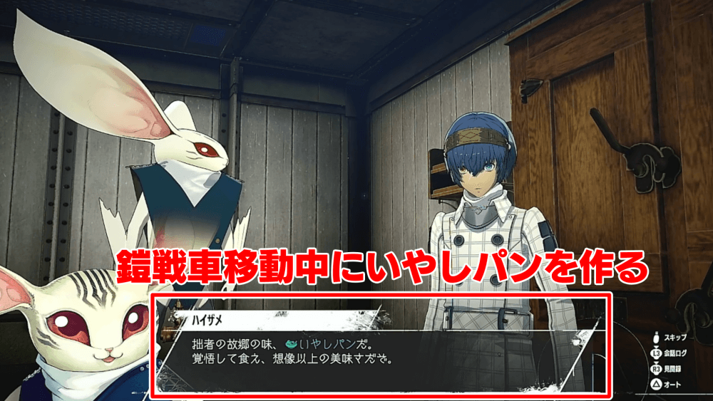 材料が集まったら、鎧戦車の調理台でいやしパンを作成する。調理台は鎧戦車が動いている時にしか使えないため、賞金首依頼などで、ダンジョンに向かっている道中に作成すると良い。
